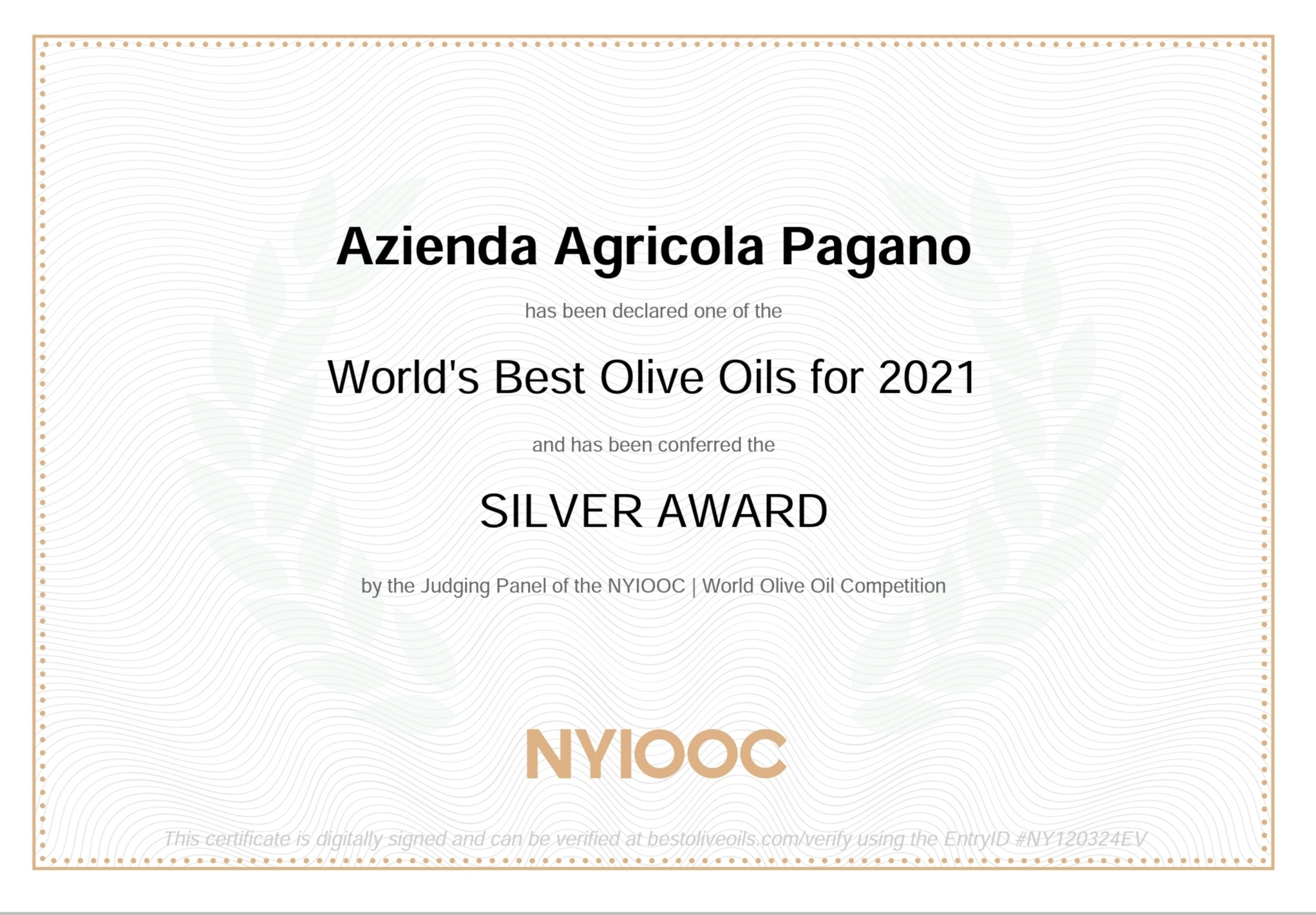 Wurde mit dem Silberpreis als eines der besten Olivenöle 2021 von der New York World Olive Oil Competition ausgezeichnet