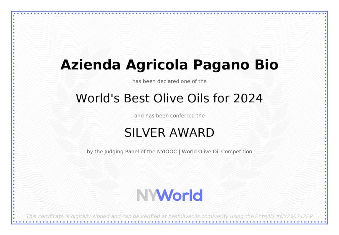 Wurde mit dem Silberpreis als eines der besten Olivenöle 2024 von der New York World Olive Oil Competition ausgezeichnet